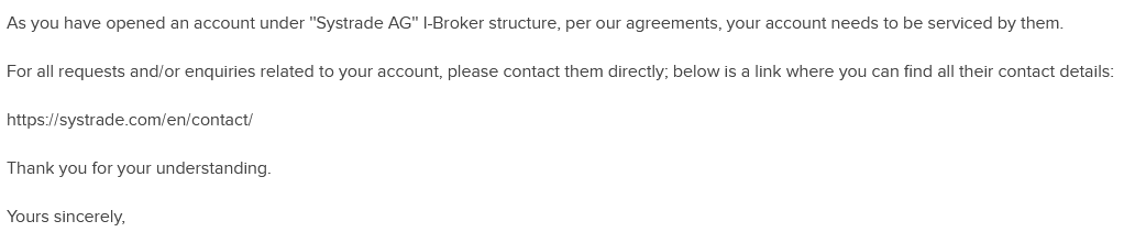 Z toho čo napísali mi to príde ako keby si mal ten účet v IBKR otvorený cez nejaké sprostredkovateľa (Systrade AG). Nevyznám sa v tom moc, ale niekde som videl že môžeš vytvárať na IBKR rôzne správcovské účty ktorý majú svojich klientov a majú rôzne práva nad jednotlivými účtami. Možno sa tu nájde niekto kto by vedel k tomu viac povedať.