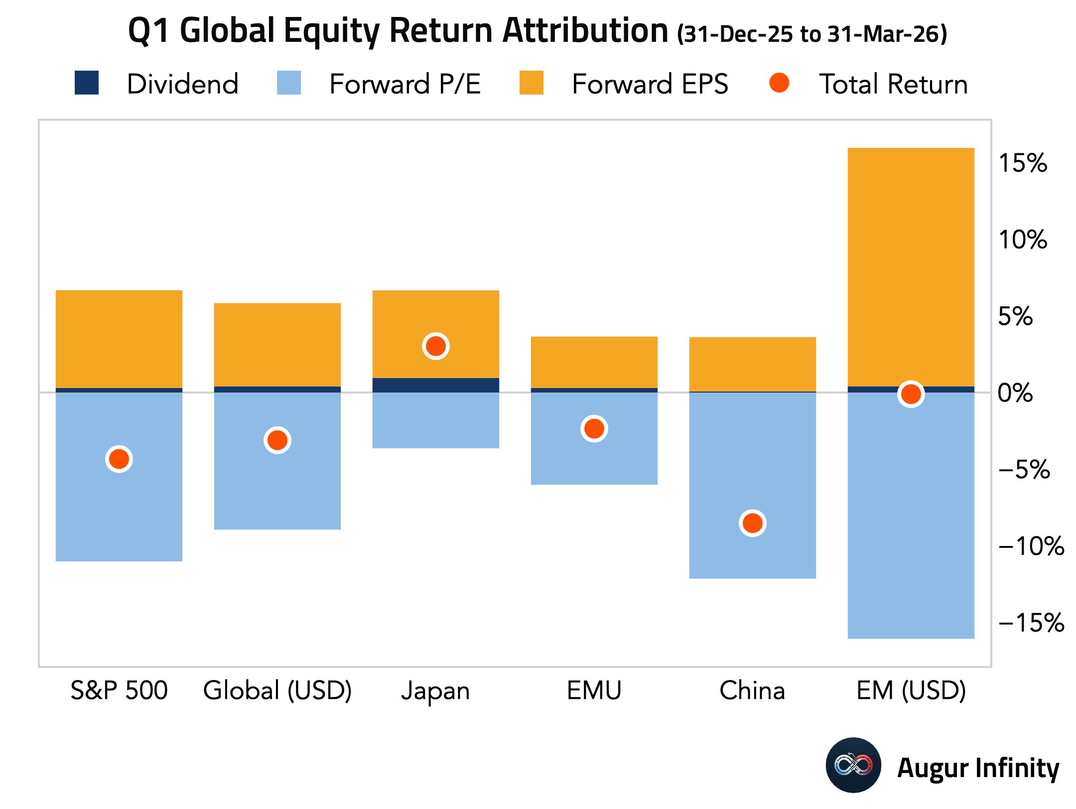 Forward EPS rose across regions in Q1, while valuation multiples contracted everywhere.
