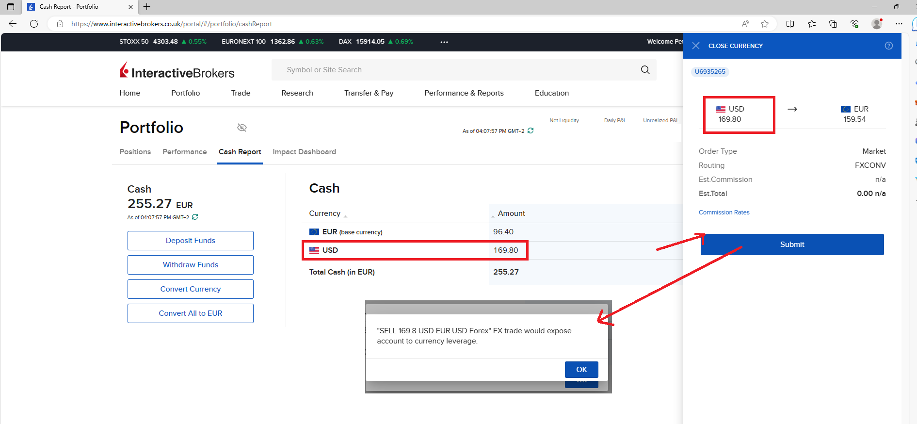 Pri zostatku kliknem na More -> pri USD convert/close balance -> predvyplní na sumu 169,80 -> keď pokračujem ešte ma upozorní, že pôjdem za market cenu a následne padne s touto hláškou, akoby som mal nedostatok USD na účte.