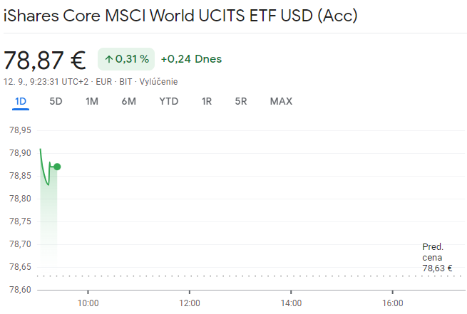 Avsak v USA potom vystrelili akcie TSLA a teda aj zvysok. Vyvoj ceny MSCI World vieme po 17.30 sledovat na burze TradeGate a tam koncila o 22:00 na 78.79 eur
