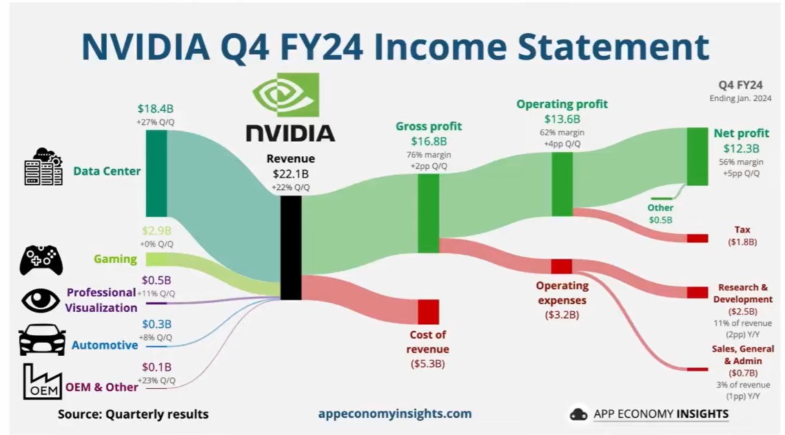 V 4. štvrťroku (január) dosiahla zisk 5,16 USD na akciu bez jednorazových položiek, čo je o 0,57 USD viac ako konsenzus FactSet na úrovni 4,59 USD; tržby medziročne vzrástli o 265,3 % na 22,1 mld. USD oproti konsenzu FactSet na úrovni 20,4 mld.