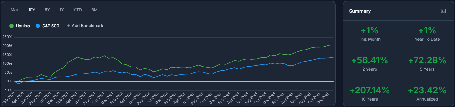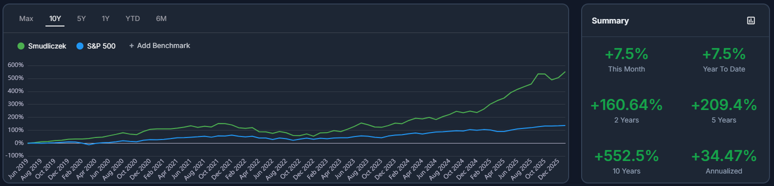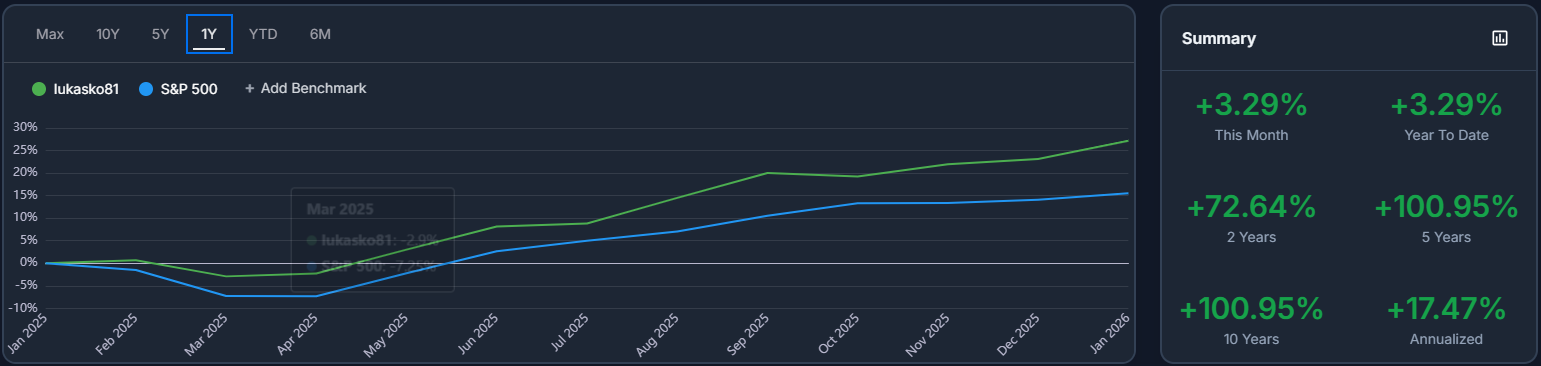 Od roku 2019 jeho portfólio prekonáva index S&P 500 v priemere o 11,82 % ročne (p.a.). Jediné roky, kedy sa mi nepodarilo prekonať S&P 500, boli 2021 a 2022.