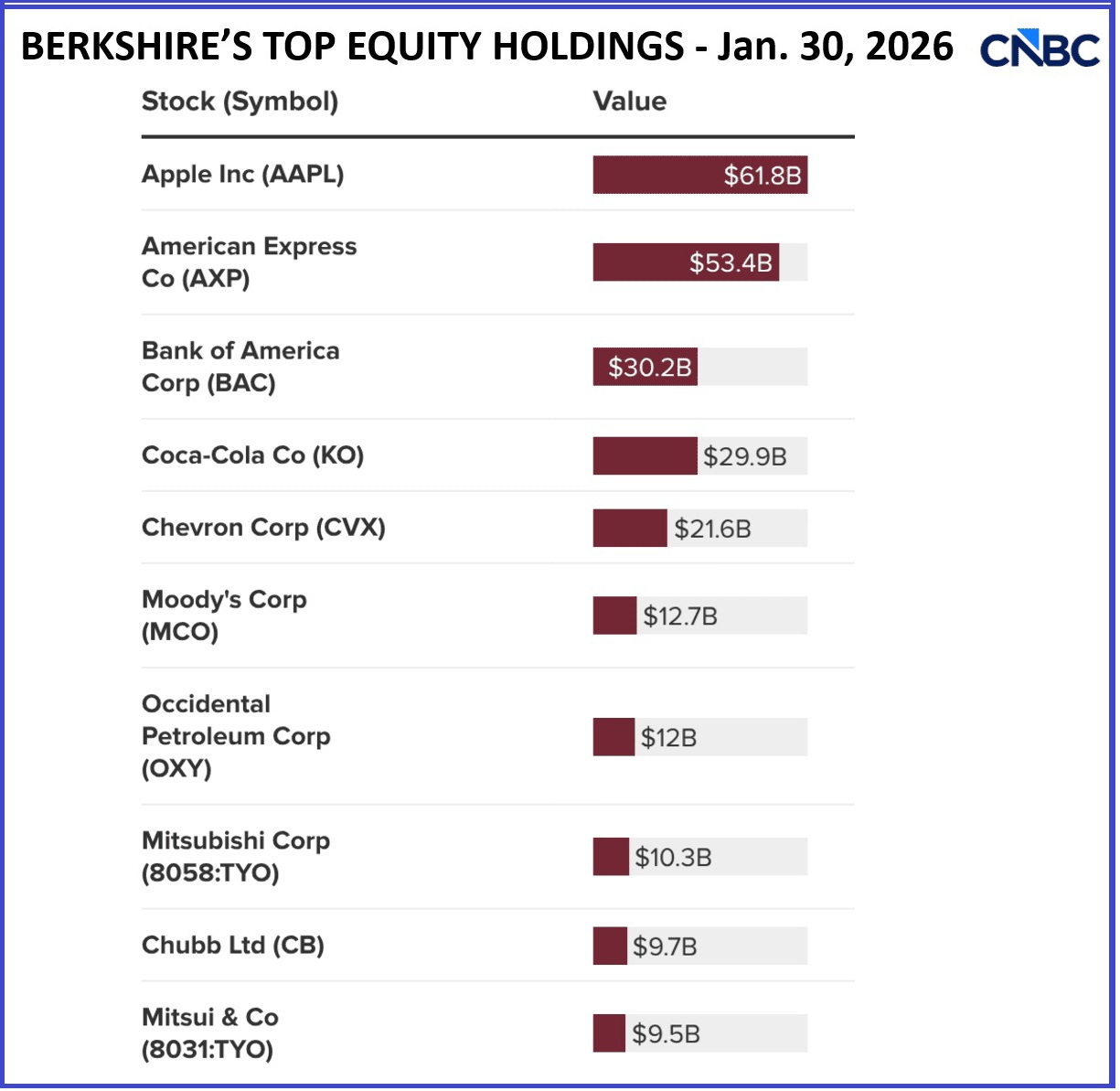 Největší pozice akcií v Berkshire Hathaway portfoliu: Apple, American Express, Bank of America, Coca Cola, Chevron, Moodys, Occidental Petroleum, Chubb, Kraft Heinz, Alphabet.