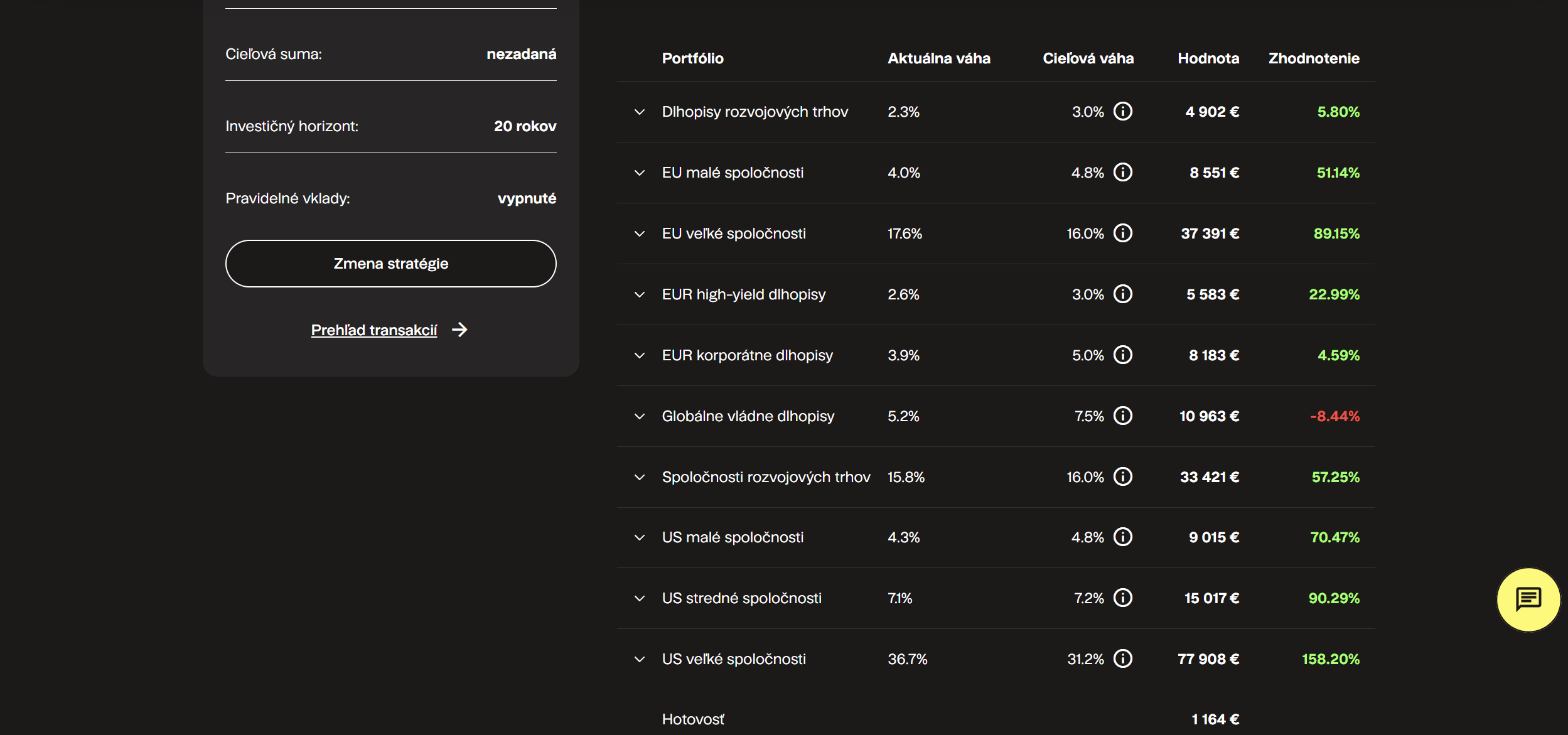 Efektívny poplatok vyjadruje váš skutočný aktuálny náklad na riadenie portfólia po započítaní vašich zliav. Ide o pomer aktuálne plateného poplatku voči hodnote účtu vrátane DPH. Cenníkový poplatok je 1% p.a. + DPH = 1,23% p.a. Cash urcite nie je zainvestovany, beru si z neho priebezne poplatky a ked klesne na nulu, tak vtedy si strhavaju poplatok az po odpredaji.