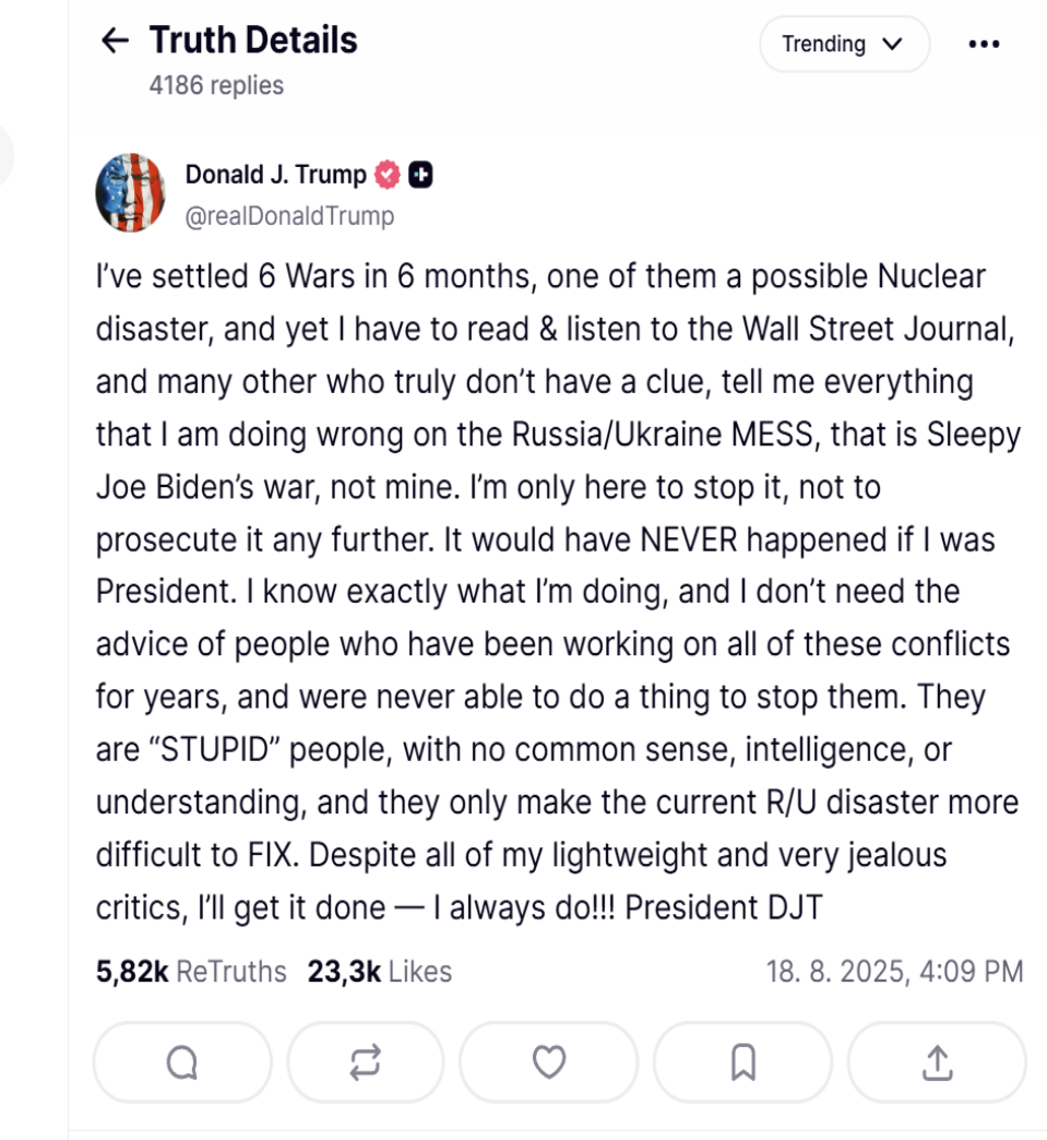 JUGGLER napísal: Pi 24 10, 2025 1:24 pm Trump práve teraz na svojej sociálnej sieti ( milé slová o susedovi):