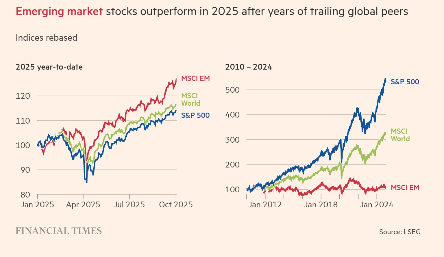 Znamená to pozoruhodný obrat oproti predchádzajúcemu desaťročiu a pol. Akcie rozvíjajúcich sa trhov výrazne zaostávali za jedným z najväčších býčích období v histórii v USA v rokoch 2010 až 2024, pričom index MSCI získal za celé toto obdobie menej ako 9 percent po tom, čo sa rast po roku 2001 zrútil do cyklov boomu a krachu.