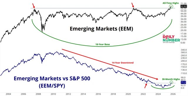 Index EmergingMarkets sa po 18 rokoch vyšplhal na nové maximum. Technické prerazenie historickej rezistencie a prudké zlepšenie relatívnej výkonnosti voči americkému trhu potvrdzujú, že kapitál na globálnych trhoch si hľadá nové cesty a ciele.