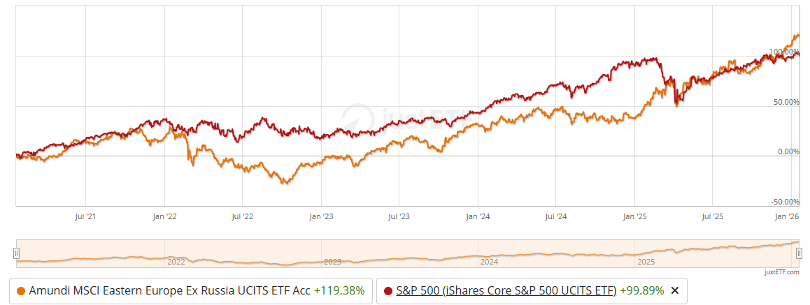 Amundi MSCI Eastern Europe Ex Russia UCITS ETF Acc rastli od 2023 najmä pre bankový sektor. Aktuálne tvori financny sektor nadštandardných 53% portfólia. Za posledné 2-3 roky narástli ceny akcii bank o násobky (pozri napr. OTP Bank, či PKO Bank ako TOP2 pozície tohto ETF). Rastli banky v celej Europe (napr., ING Bank), ale tu v regióne to je to extrem. A ked lokalne meny (PLN a HUF) posilnuju vocu EUR (mena tohto ETF), tak to este zvyraznuje rast ceny tohto ETF.