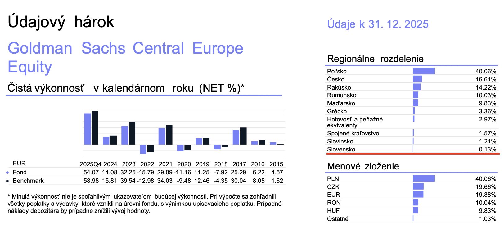 Váha Slovenska v portfóliu Goldman Sachs Central Europe Equity je 0,13 % k 31.12.2025.