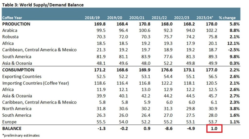 Americké ministerstvo zemědělství (USDA) koncem června naopak odhadovalo, že se produkce v marketingové sezóně zvýší o 2,5% meziročně na 178 miliónů 60 kg žoků s 1,7% poklesem u arabiky a 7,9% růstem u robusty. Celkové konečné zásoby 2025/26 se dle USDA mají zvýšit o 4,9%. To by bylo po letech deficitů v nabídce jistě příznivé pro tlaky na cenu dolů. Nicméně, pokud odhad správný, pak by ovlivňovalo cenu až od příštího roku. Podobně již dříve předpovídá převis nabídky Mezinárodní organizace kávy (ICO) od marketingové sezóny 2023/24: