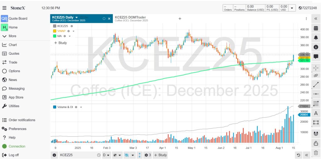 Cena komodity je tak v tomto roce nyní stále pozitivní, ale již jen 15%. Technicky i fundamentálně v tuto chvíli doposud vypadá, že by trend nahoru mohl zase pokračovat. Dle brazilské exportní společnosti Cecafe minulý měsíc poklesly minulý měsíc u arabiky o 21% a u Robusty 49% meziročně! Souvisejícími faktory jsou redukce zásob monitorovaných burzou ICE v New Yorku (u arabiky na 1-leté minimum) a nejasnosti ohledně cel na brazilské exporty ve výši 50%, zdá zůstanou v platnosti také u kávy.