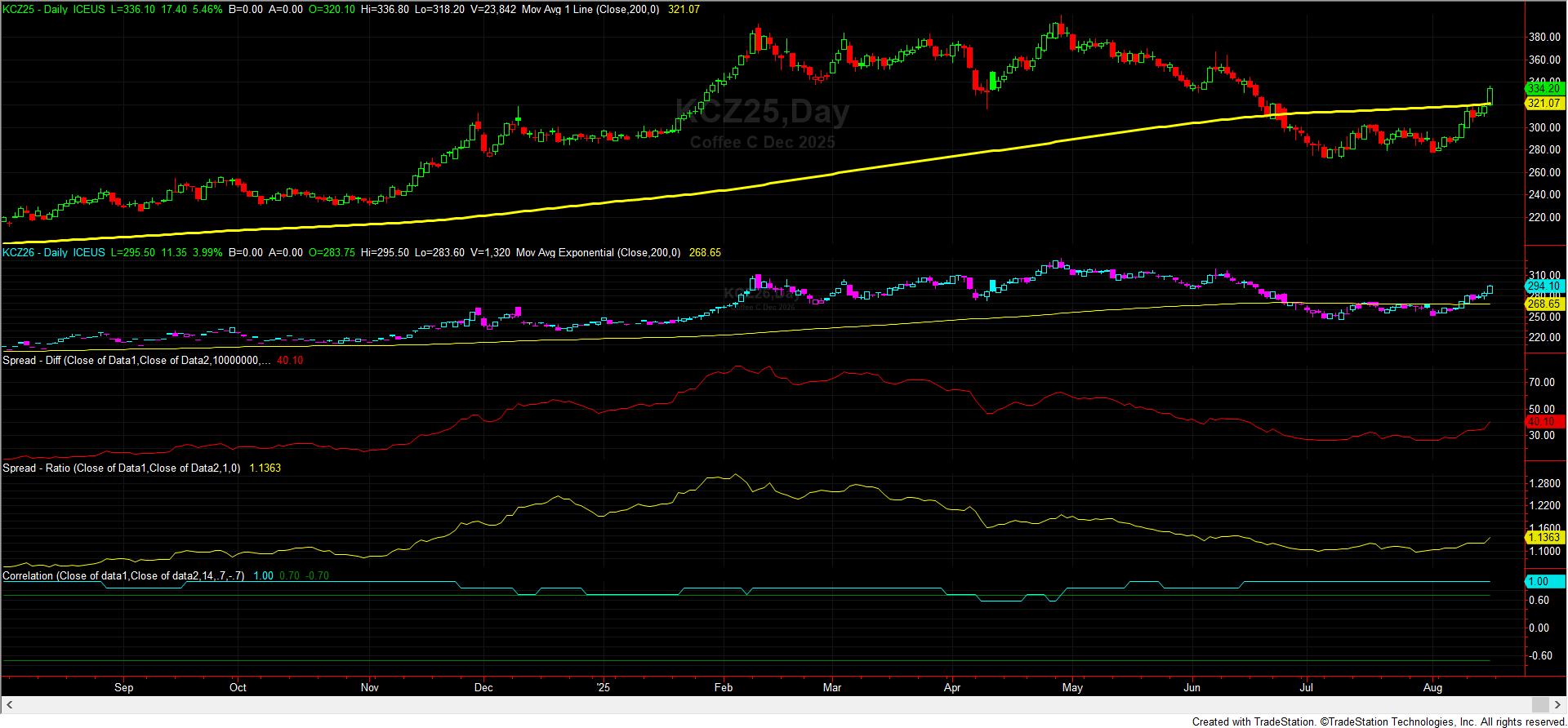 Deficity v nabídce od marketingové sezóny 2021/2022 kombinované se silnou poptávkou a nejasností ohledně produkce odrůdy arabiky v Brazílii způsobily na začátku roku silný růst ceny. Skutečně, studie Světové banky předpovídá zhodnocení arabiky o více jak 50% v 2025. Na jaře akcelerace ve sklizni převážně robusty ve Vietnamu a odhady silných exportů na rozhodující trhy v USA a EU, způsobily korekci ceny i do záporu v tomto roce. Cena kávy v posledních seancích na opětovně otočila a posílila nad 200-denní klouzavý průměr: