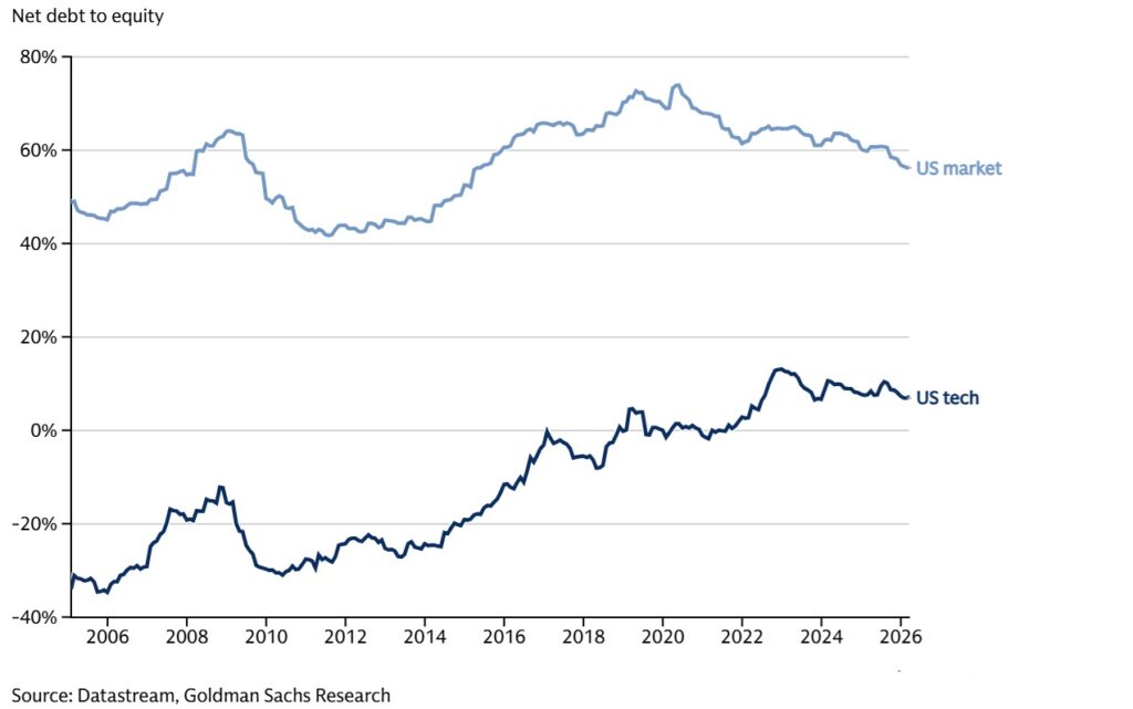 Má-li vyšší inflace skutečně jistou chvíli přetrvat, pak zvýšené úroky u dluhu mohou akcelerovat případnou krizi. U technologických firem však je podíl dluhu na kapitálu velmi nízký a mnohem menší v komparaci s celkovým trhem: