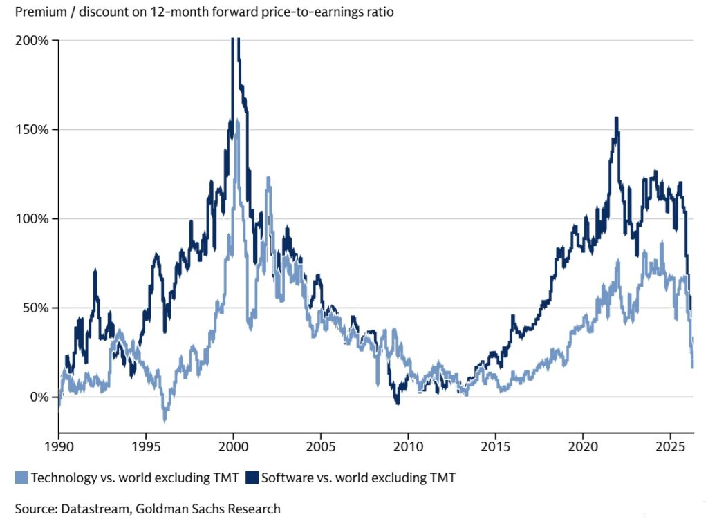 V souvislosti s poslední korekcí 9,1 % indexu S&P 500 od konce ledna do konce března a rotací z technologických AI akcií do širšího spektra titulů v indexu se forward P/E valuační poměry u subindexů S&P telekomunikačních služeb a IT dostaly v podstatě na hodnotu blízkou jako u samotného S&P 500 kolem 20. Skutečně, hodnota prémie, kterou jsou investoři ochotní platit extra za vyšší zisky tech firem v budoucnu oproti minulosti se dostala blízko nule: