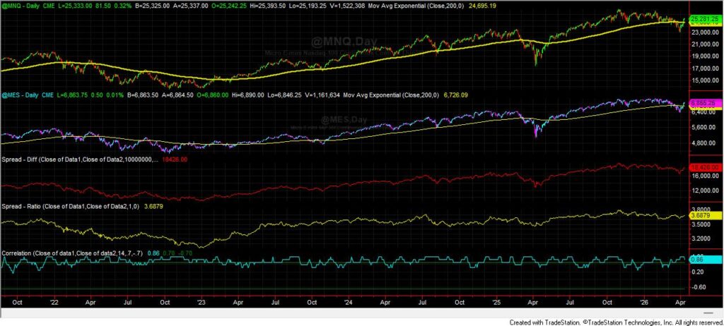 Závěrem se pojďme podívat na vývoj populárních index kontraktů na micro Nasdaq 100 (MNQ) a micro S&P 500 (MES) a jejich spreadové a korelační poměry na burzách v Chicagu od konce 2021 (Tradestation, denní data):