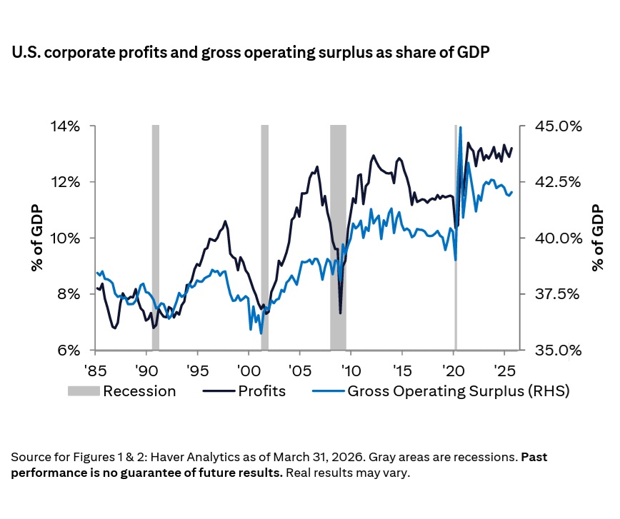 Co je však v tuto chvíli nejistoty omezeno je růst akciového trhu na základě expanze valuačního multiplikátoru (P/E). Tudíž je nutno, aby tento vycházel převážně na základě růstu zisků firem a zde se ukazují nejlépe nastaveny trhy USA a Japonska, kde můžeme pozorovat růst firemních zisků k HDP. Mnohé další země nereportují explicitně korporátní zisky v systémech národních účtů. Nicméně, dle hrubých přebytků z provozní činnosti (GOS), poskytující signál o ziskových maržích, můžeme pozorovat klesající tendence k HDP u Evropy a Británie ve srovnání s růstovým trendem USA a Japonska. Jako příklad Spojené státy: