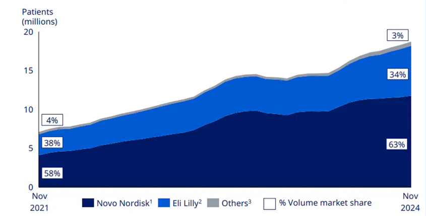 Tento trh zahŕňa aj ďalšie GLP-1 produkty, ako sú Ozempic od Novo Nordisk a Mounjaro od Eli Lilly, ktoré sú v podstate rovnaké ako Wegovy a Zepbound, ale sú uvádzané na trh a schválené na liečbu cukrovky. Novo Nordisk a Eli Lilly sú jediní dvaja veľkí hráči na tomto trhu a preto je pre investorov dôležité sledovať, kto globálne získava alebo stráca trhový podiel.