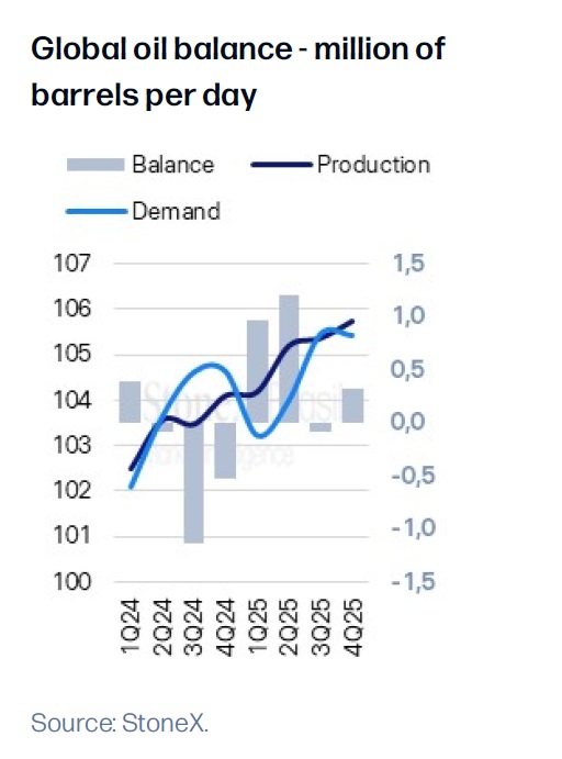Ve 3. kvartále může být trh s ropou těsnější s ohledem na letní řidičskou sezónu na severní polokouli. Nicméně ke konci roku by se se měl převis nabídky opět projevit a cena komodity může oslabovat k 50 USD za barel. Globální nabídková a poptávková balance včetně predikce je pak: