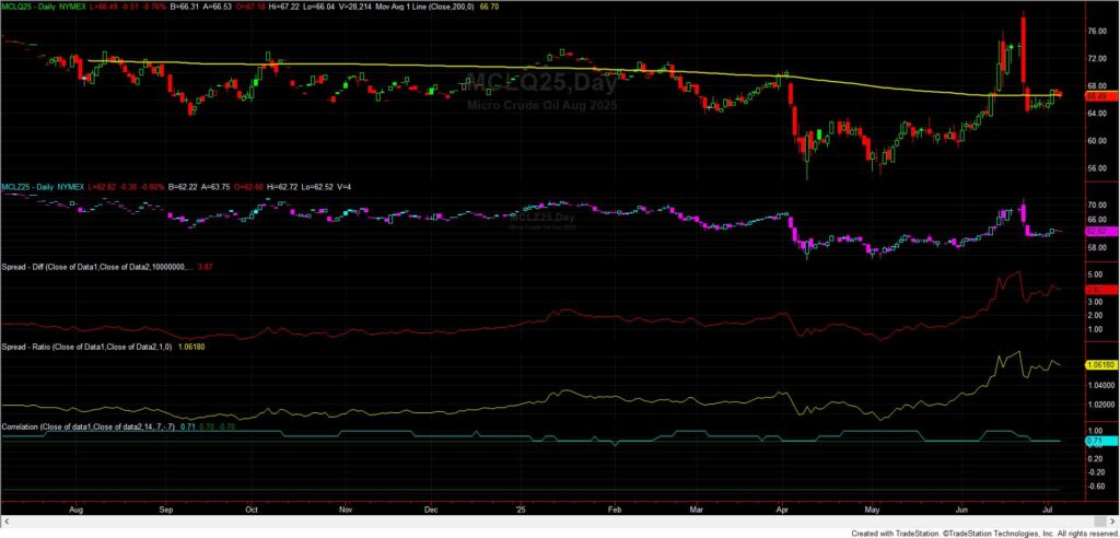 Závěrem se pojďme podívat na cenové trajektorie populárních instrumentů na aktivum kontrakt micro WTI ropy a její spreadové a korelační poměry s kontraktem pro konec roku na burze v Chicagu za posledních 12 měsíců (Tradestation, denní data):