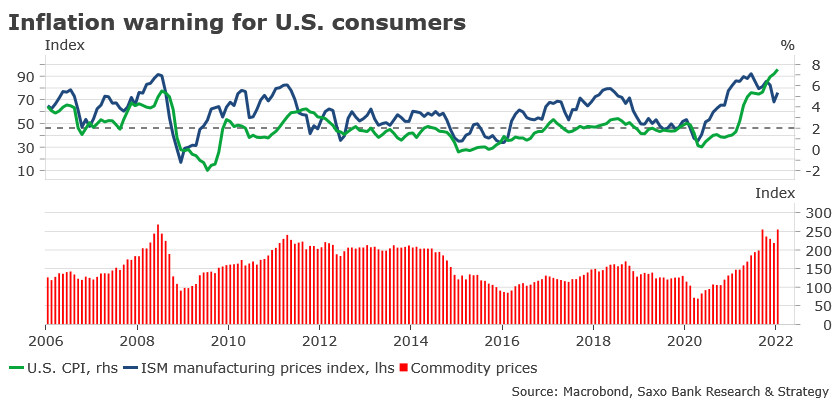 Index spotrebiteľských cien (CPI) sa v USA zvýšil v januári na 7,5 %, čo je viac ako sa očakávalo. Inflácia je prítomná naprieč odvetviami a jej veľká časť je štrukturálna. Jej skrotenie si tak vyžiada od Fedu oveľa viac ako zvýšenie úrokových sadzieb o 50 bázických bodov (bps). „Môžeme preto očakávať, že cyklus zvyšovania úrokových sadzieb bude z krátkodobého hľadiska veľmi agresívny,“ predpokladá Christopher Dembik, makro analytik Saxo bank.